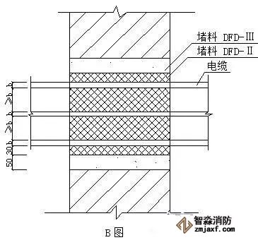 ⑵B圖電纜穿過墻上的孔洞,間隙用堵料填塞。