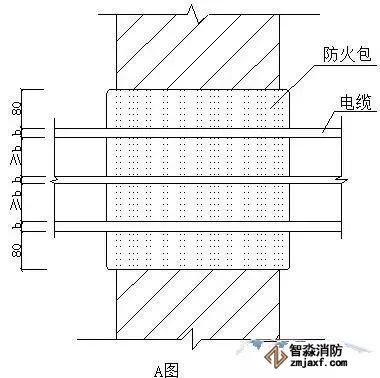 ⑴A圖用防火包封堵墻上孔洞,電纜從防火包內(nèi)穿過。