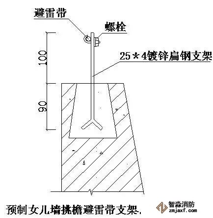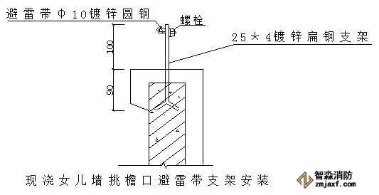 ⑴現(xiàn)澆女兒墻挑檐避雷帶支架安裝做法如下圖,扁鋼支架在安裝時要密切和土建專業(yè)配合好,對成排的避雷帶支架的水平度、垂直度要拉線逐個檢查。