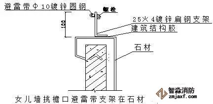 ⑷ 女兒墻挑檐用石材等裝飾材料包住后,避雷帶支架在石材上的固定做法如下圖: