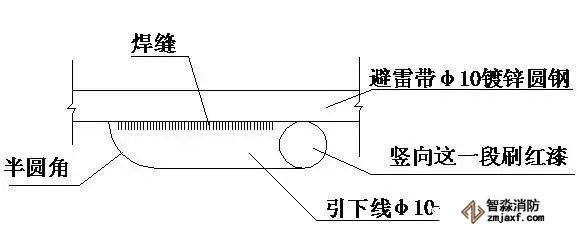 ⑵引下線在女兒墻與避雷帶之間這一段要刷紅色的油漆做明顯的標記,在防雷檢查驗收時,避雷引下線處很顯眼,一看就明白此處為引下點,見下圖。