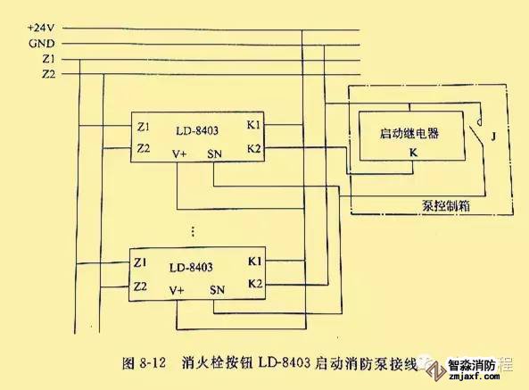 消火栓按鈕的信號(hào)總線(xiàn)采用RVS型雙絞線(xiàn),截面積≥1.0m㎡;控制線(xiàn)和應(yīng)答線(xiàn)采用BV線(xiàn),截面積≥1.5m㎡。用消火栓按鈕LD-8403啟動(dòng)消防泵的接線(xiàn)如圖8-12所示。