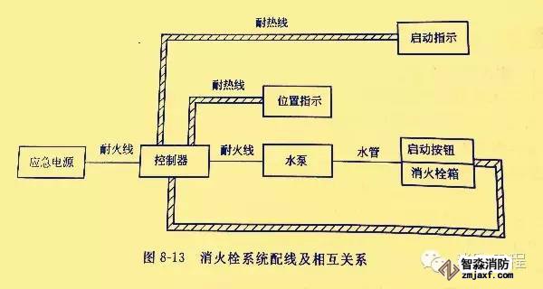 消火栓系統(tǒng)的配線(xiàn)及相互關(guān)系如圖8-13所示。
