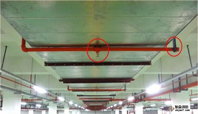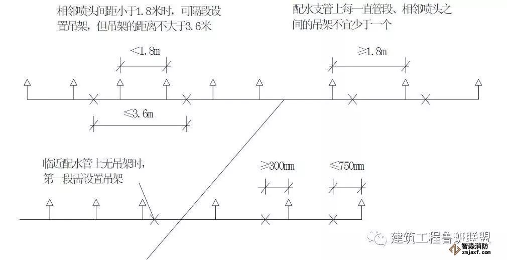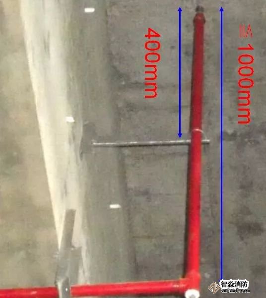 2、當(dāng)噴淋支管高度大于1000mm時(shí),應(yīng)設(shè)橫向加強(qiáng)支架;末端支架與噴頭之間的距離為400mm