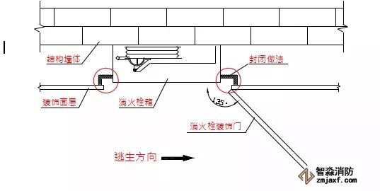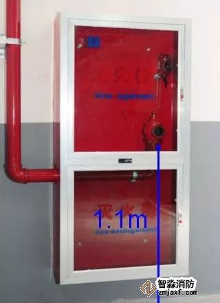 消火栓不在門軸側(cè),應(yīng)在開啟側(cè);消火栓口中心離地高度為1.1 米,允許偏差±10mm