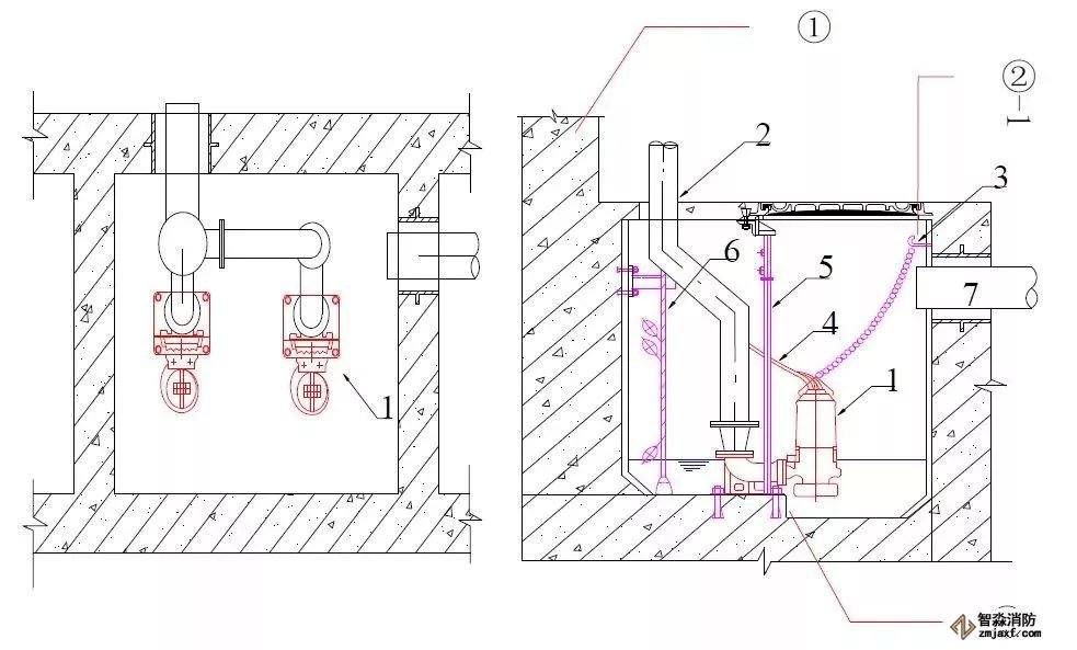 2、潛污泵排水管閥門與部件從下往上依次為:軟接頭—壓力表—止回閥—閘閥,閘閥的安裝高度為地坪完成面上1.5m,三通高度宜為地坪高度2m處