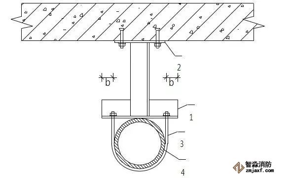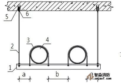 1.支架橫擔(dān) 2.鍍鋅螺桿 3.管碼 4.管道 5.頂爆螺栓 6.緊固螺栓
