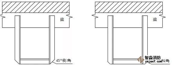 當(dāng)梁、通風(fēng)管道、排管、橋架寬度大于1.2 m時(shí),增設(shè)的噴頭應(yīng)安裝在其腹面以下部位;風(fēng)管下噴頭吊架應(yīng)采取管道延長至風(fēng)管另外一端邊緣,并在延伸管道末端設(shè)置吊架