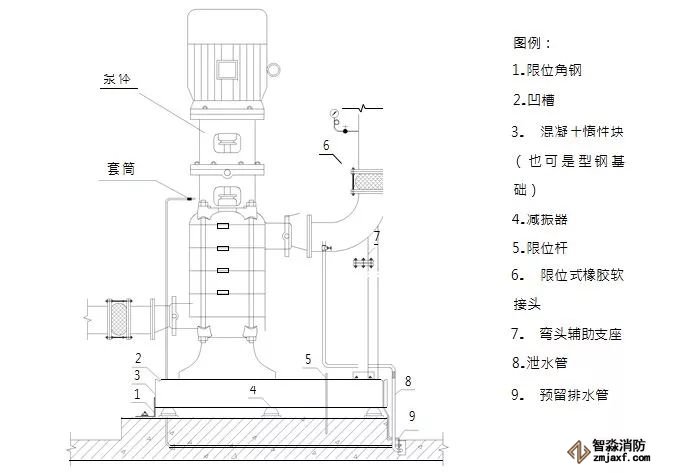 1、立式水泵底座下應(yīng)設(shè)槽鋼基礎(chǔ),擴(kuò)大立式水泵基礎(chǔ)接觸面積,增加水泵平穩(wěn)牢固性;槽鋼基礎(chǔ)與水泵底座螺栓剛性連接