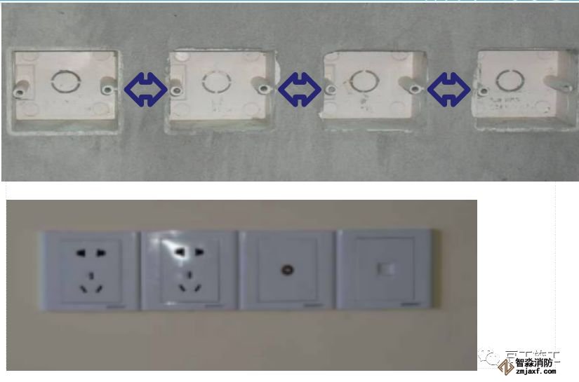 開關、插座、燈位盒,必須嚴格按實際圖紙和規(guī)范來定位。開關插座的測量定位分為三個方面:平面位置、高度、與墻面凹凸距離。要按各種器具設計高度安裝其接線盒。對剪力墻上的線盒,以土建柱筋上的紅記頂端為50cm基準來測量,同時各接線盒之間用水平管復測標高是否一致。接線盒的平面位置必須以軸線為基準來測定,用土建墻線來復核。