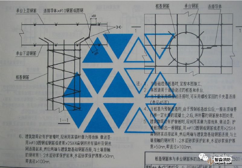 接地裝置 利用建筑物基礎圈梁內(nèi)(外圍)對角的二根主鋼筋焊接成環(huán)網(wǎng)(主筋小于ø12的須采用4根主筋),引下線與環(huán)網(wǎng)焊成一體。接地體(線)的連接應采用焊接,焊接處焊縫應飽滿并有足夠的機械強度,不得有夾渣、咬肉、裂紋、虛焊、氣孔等缺陷,焊接處的藥皮敲凈后,做防腐處理?;A接地工程完工后,在各接地極引出線處作接地電阻測試,要求接地電阻R<1歐姆,未能達到要求時,須增加人工接地極,直到符合要求為止。