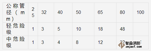 (2)輕危險(xiǎn)級(jí)、中危險(xiǎn)級(jí)場(chǎng)所中配水支管、配水管控制的標(biāo)準(zhǔn)噴頭數(shù),不應(yīng)超過(guò)表5一1的規(guī)定。